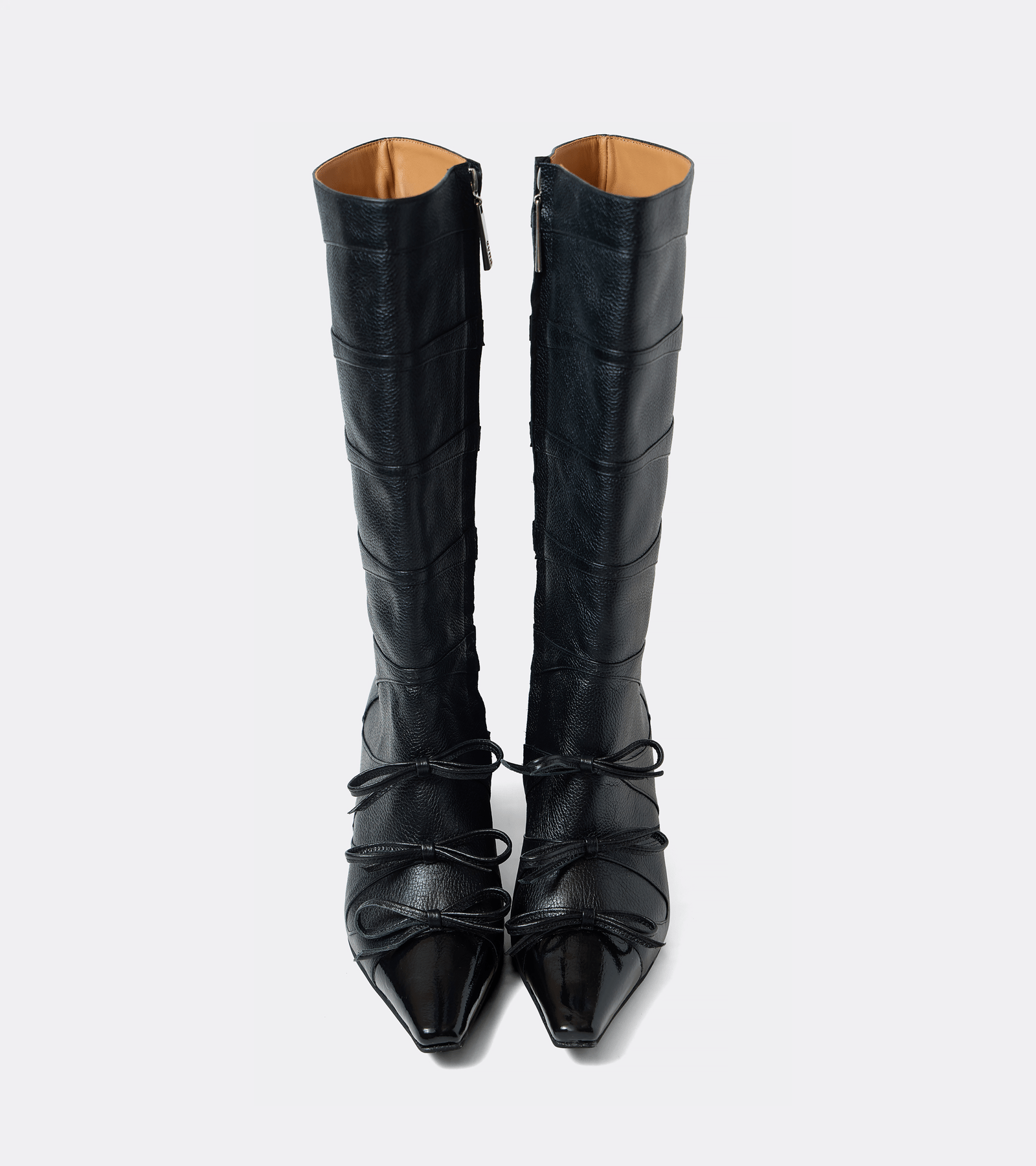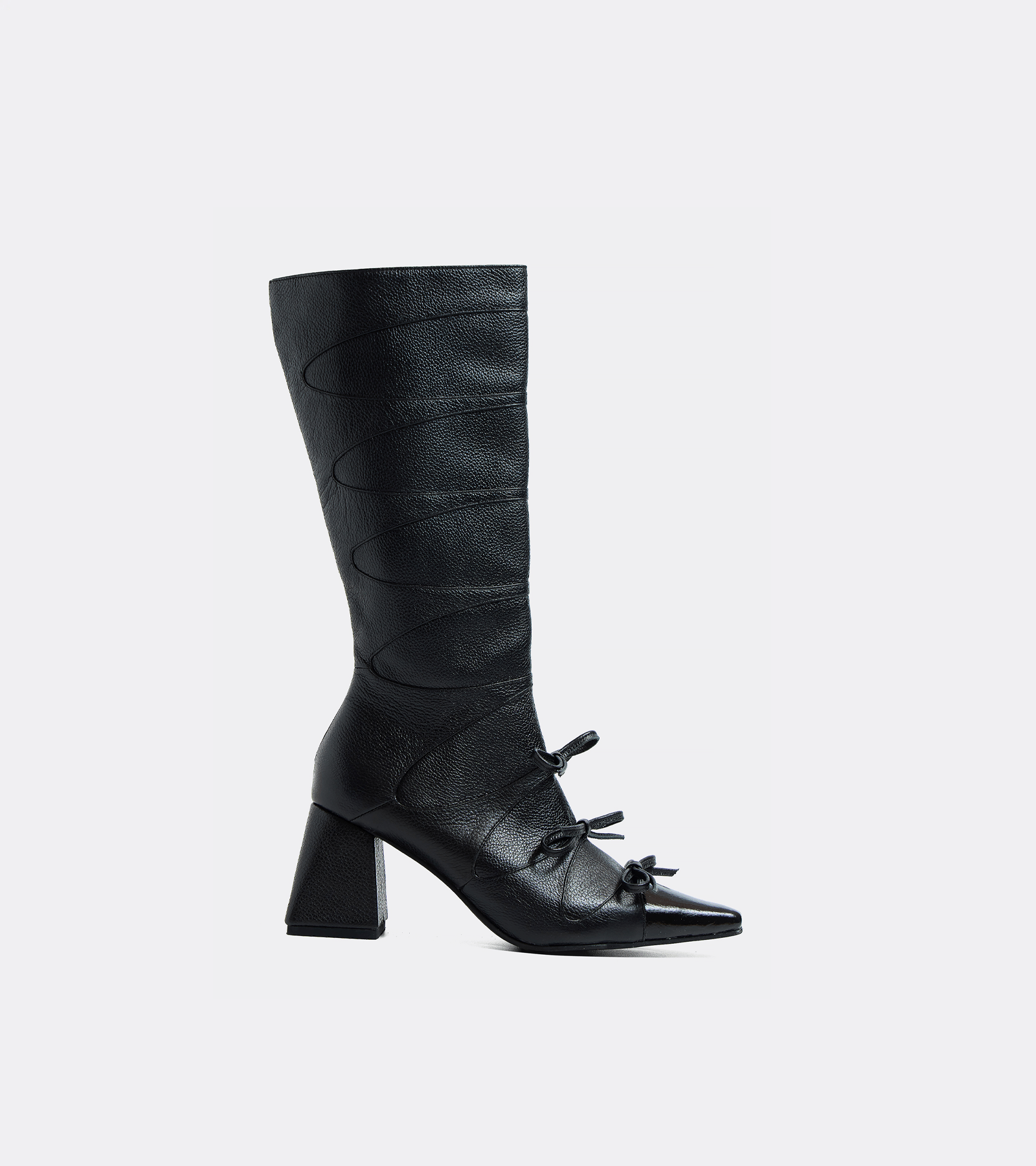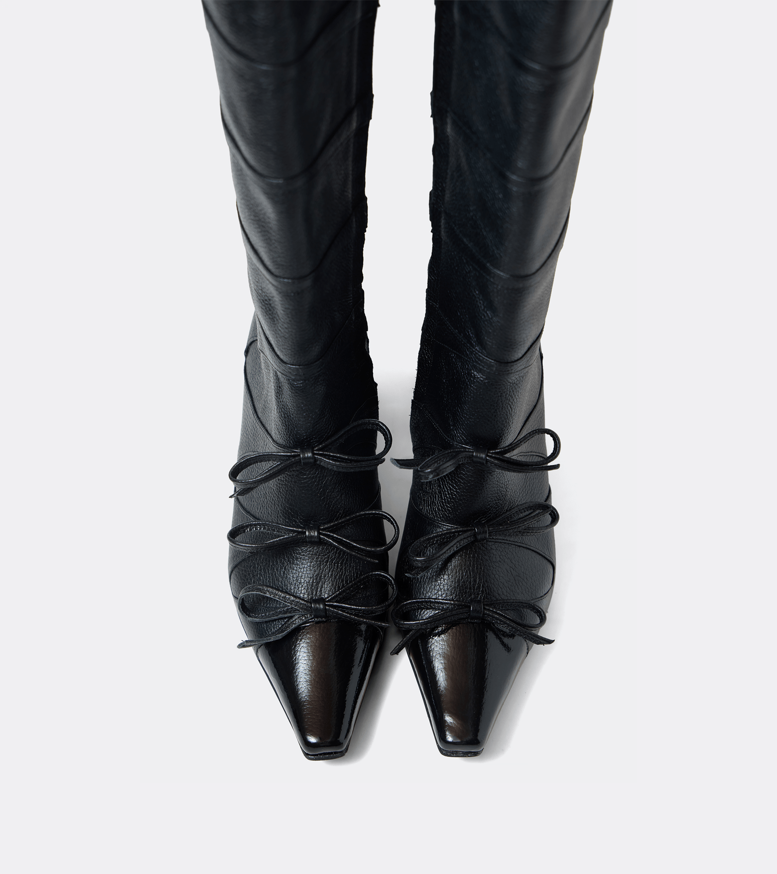 Botas en punta con cortes curvos y lazos.