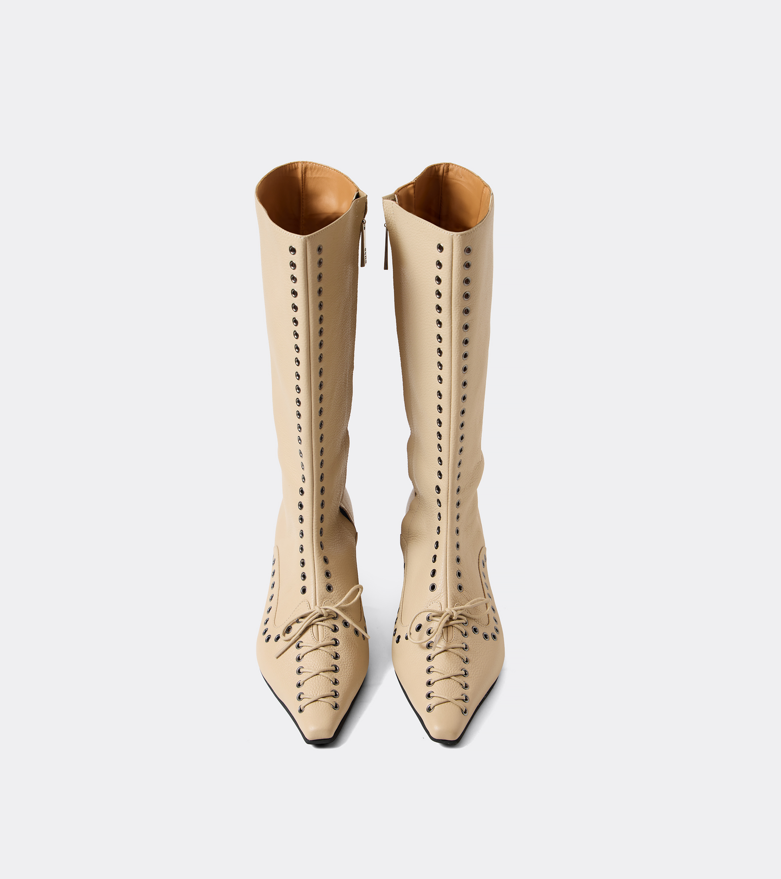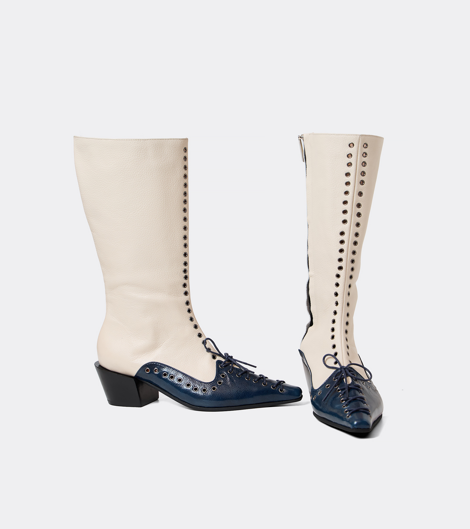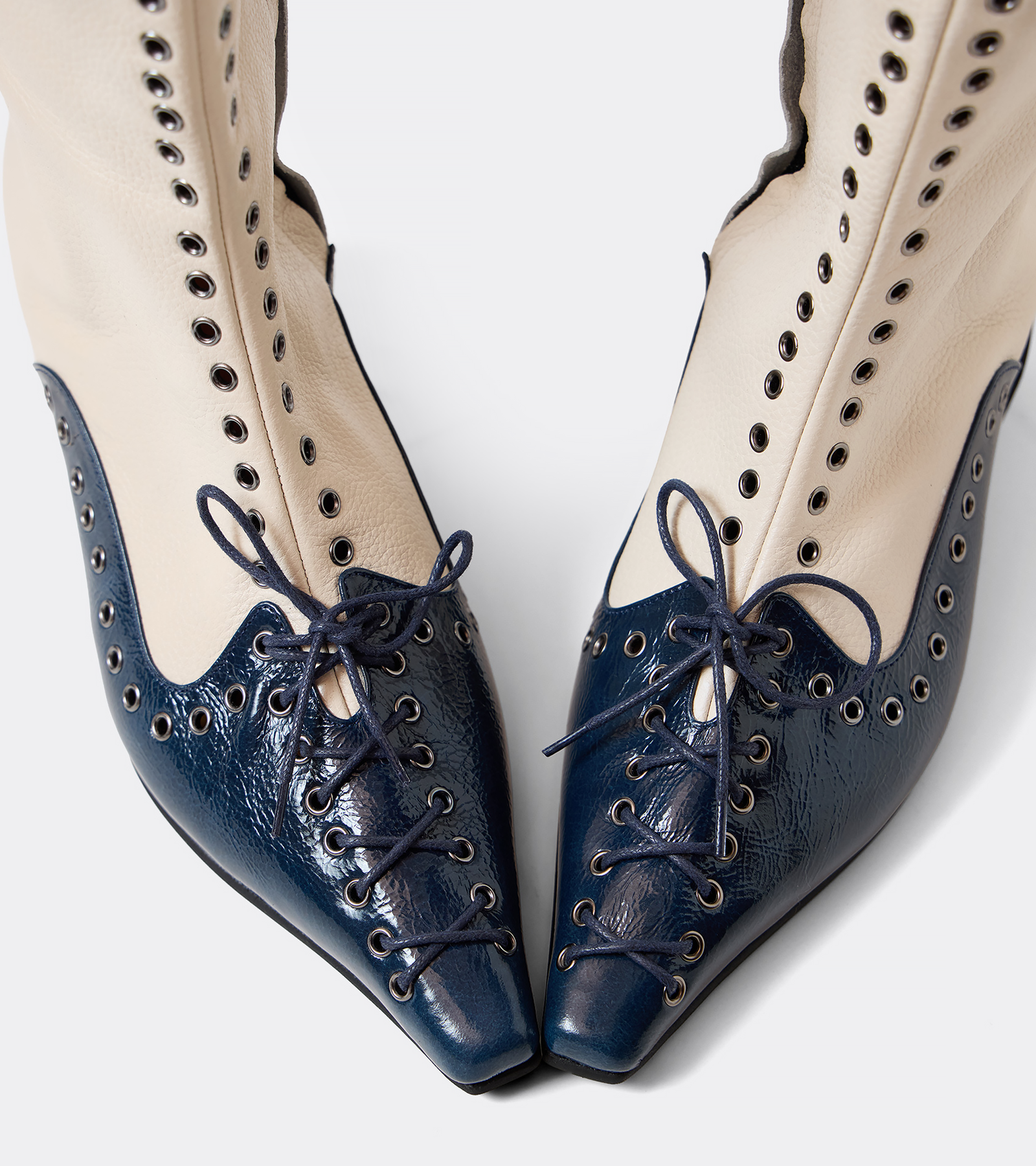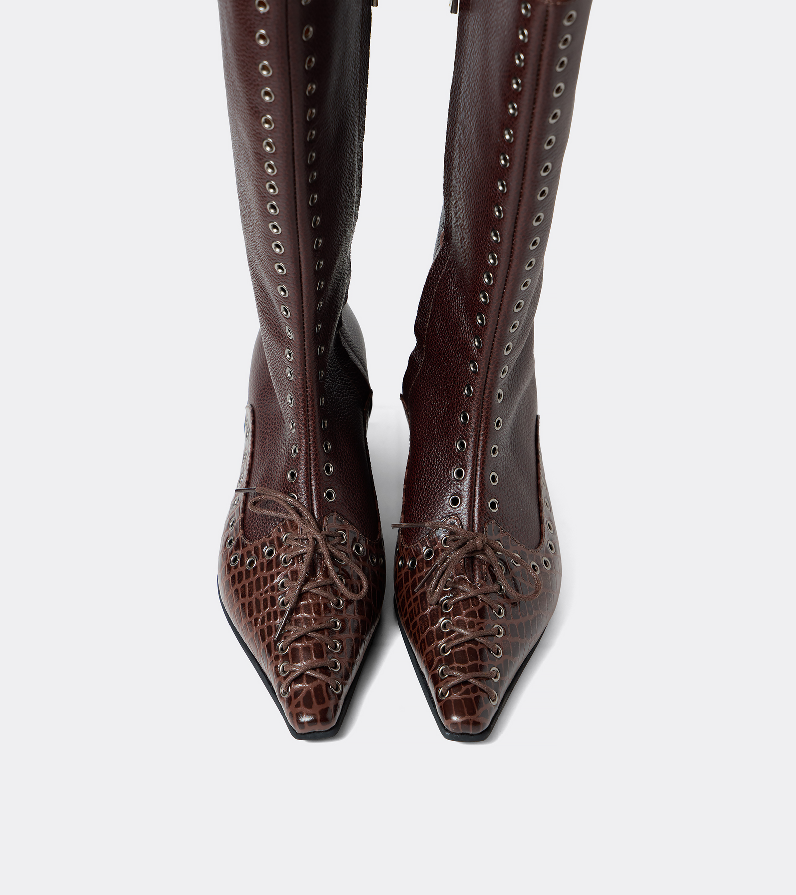 Botas en punta con terminación cuadrada, pasadores decorativos y ojalillos recorriendo toda la caña.