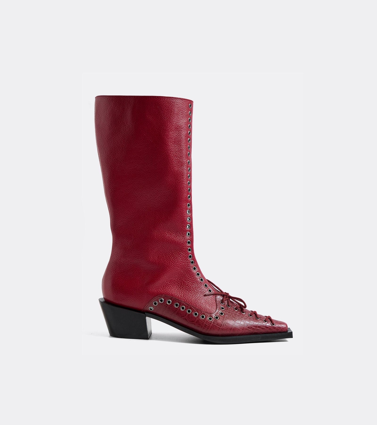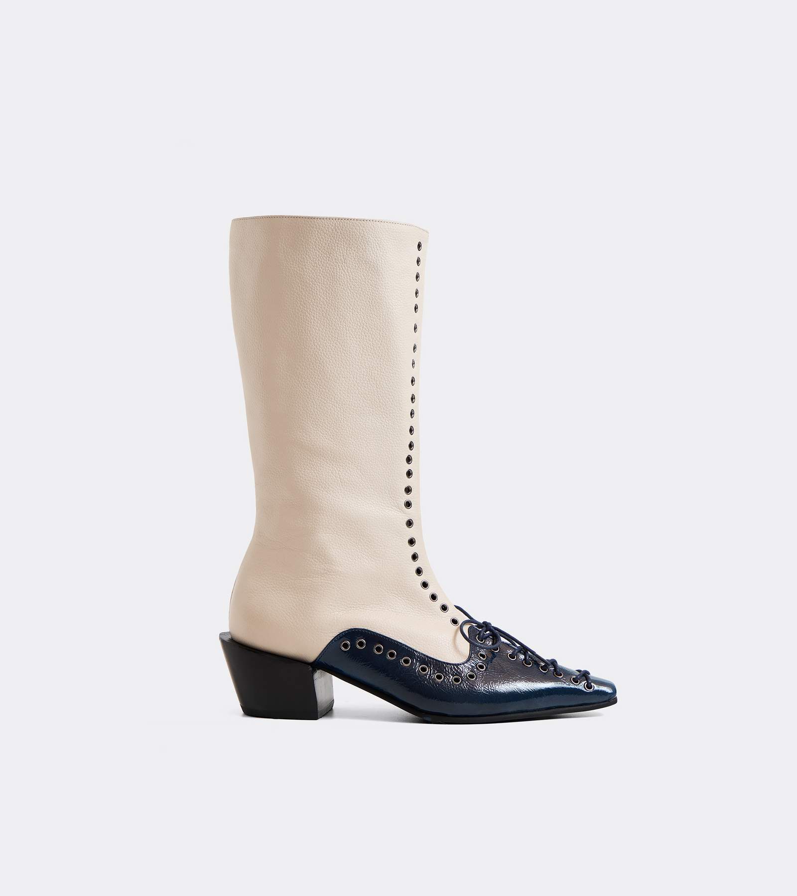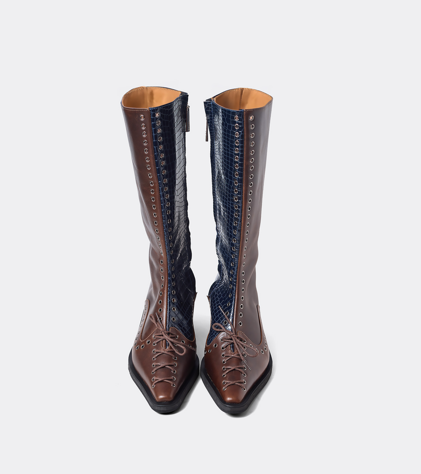 Botas en punta con terminación cuadrada, pasadores decorativos y ojalillos recorriendo toda la caña.