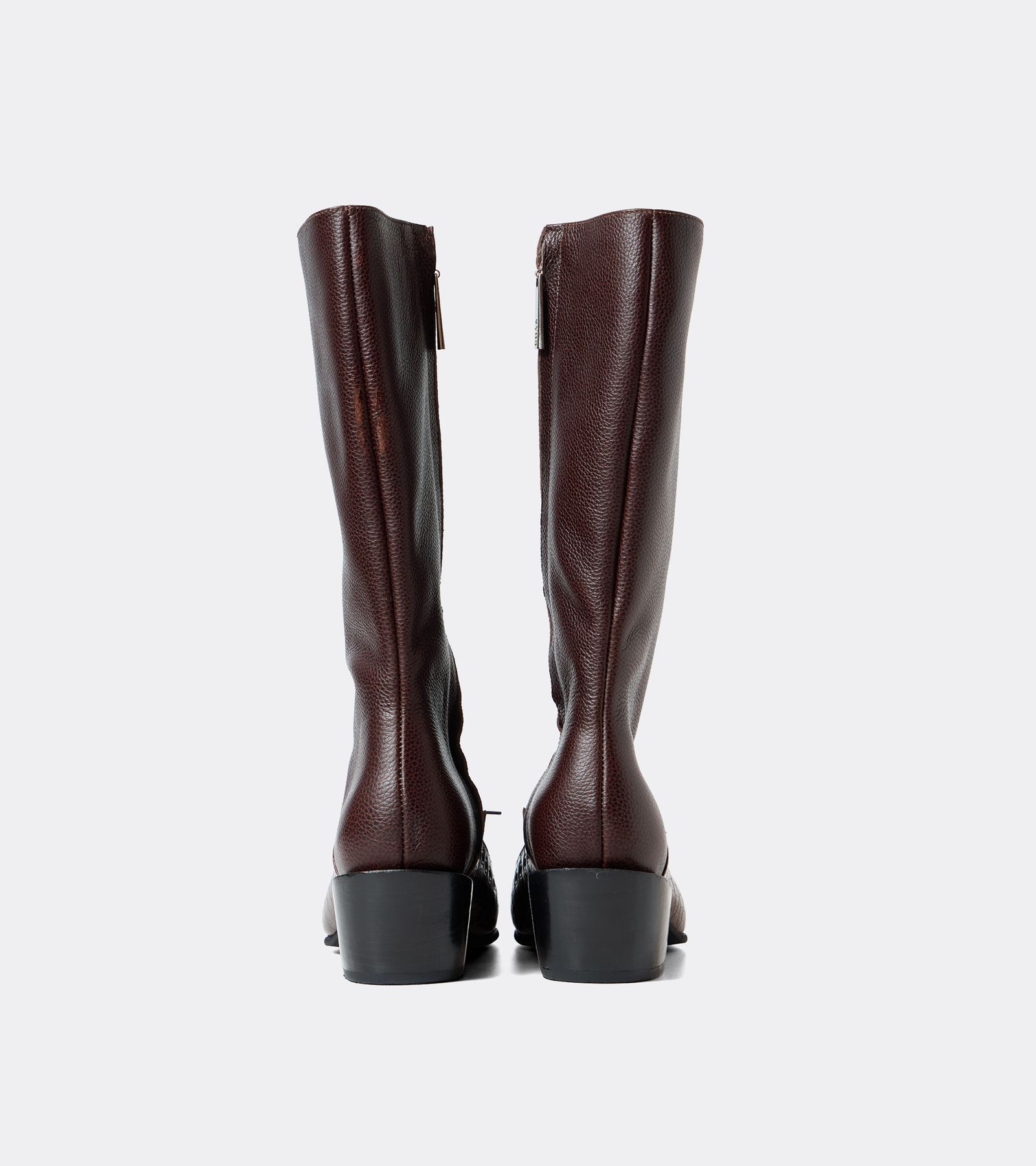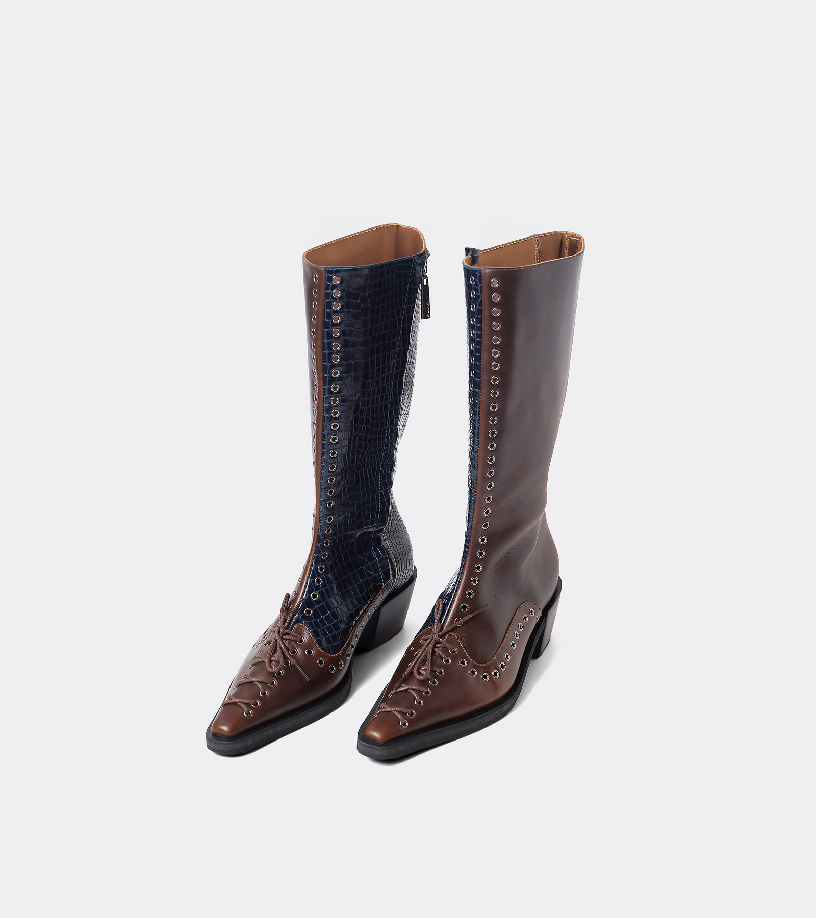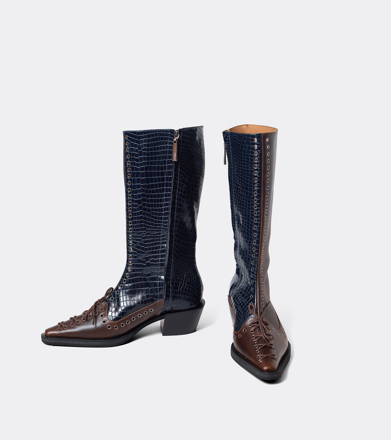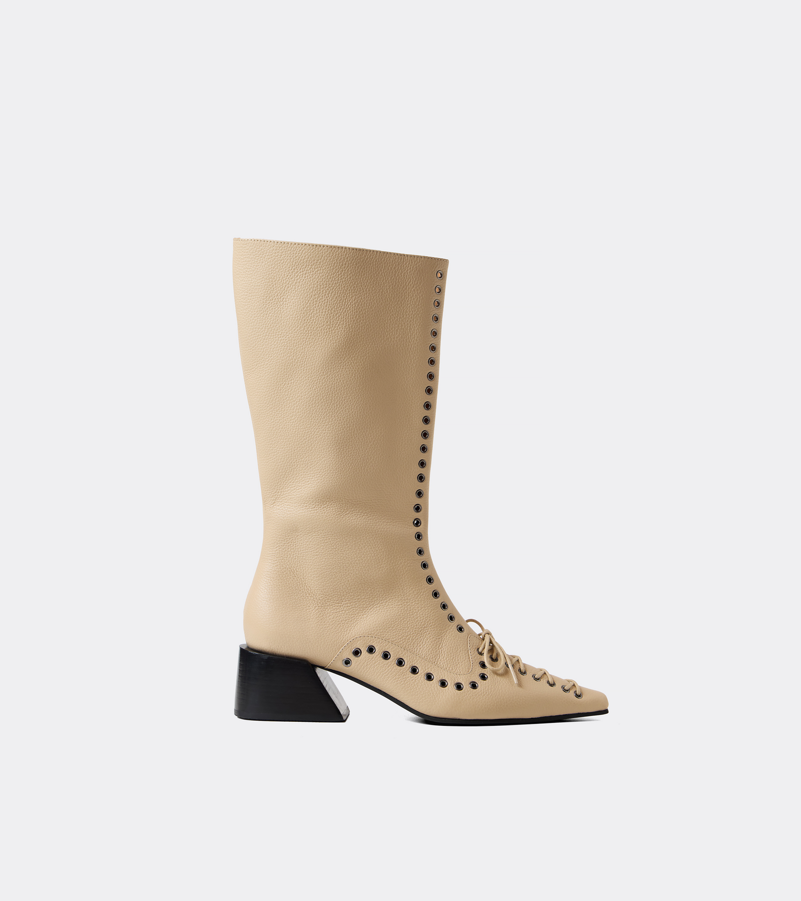 Botas en punta con terminación cuadrada, pasadores decorativos y ojalillos recorriendo toda la caña.