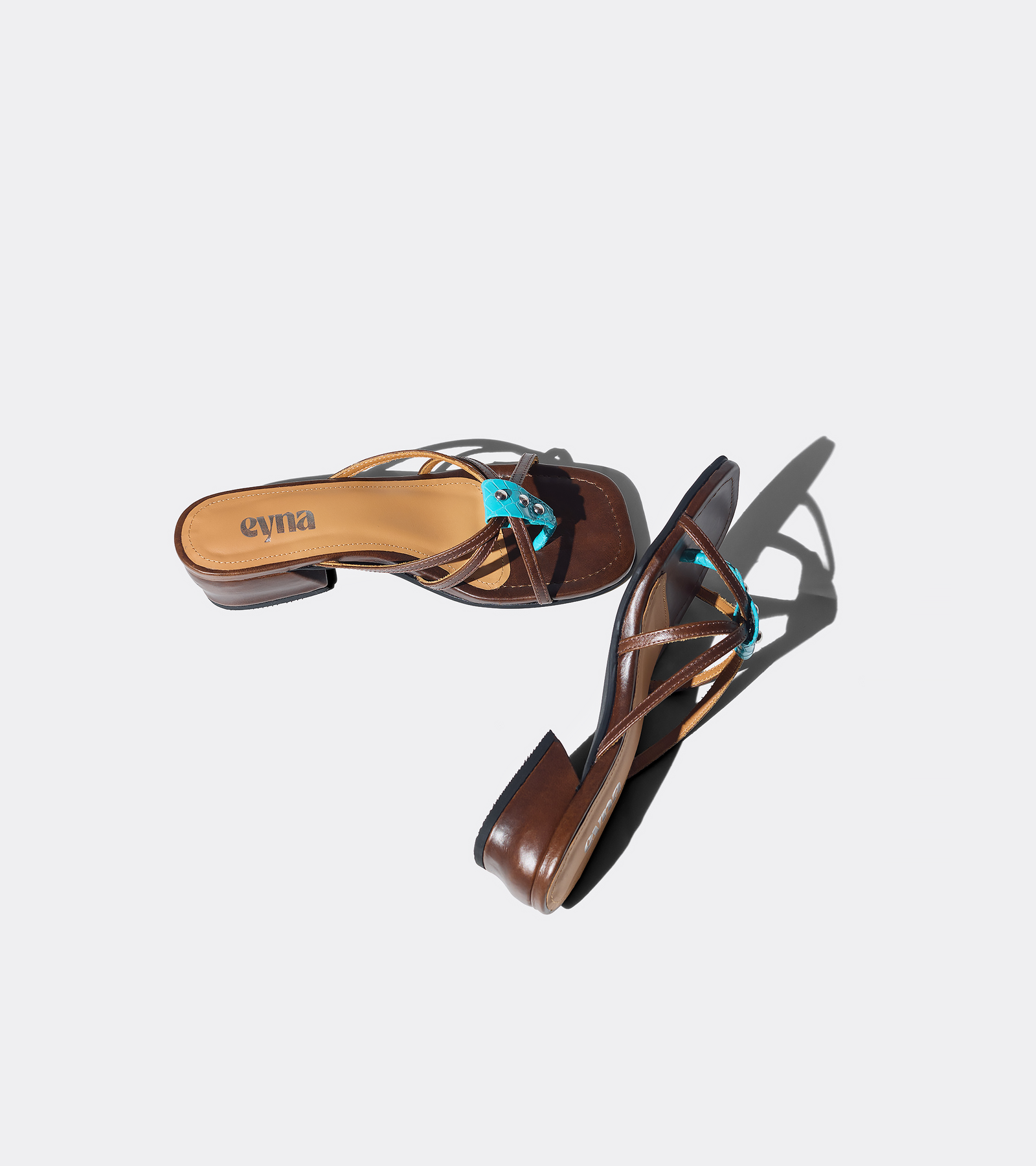 Sandalia de silueta ligera con tiras finas cruzadas en cuero marrón y un acento turquesa que corta la composición con fuerza.