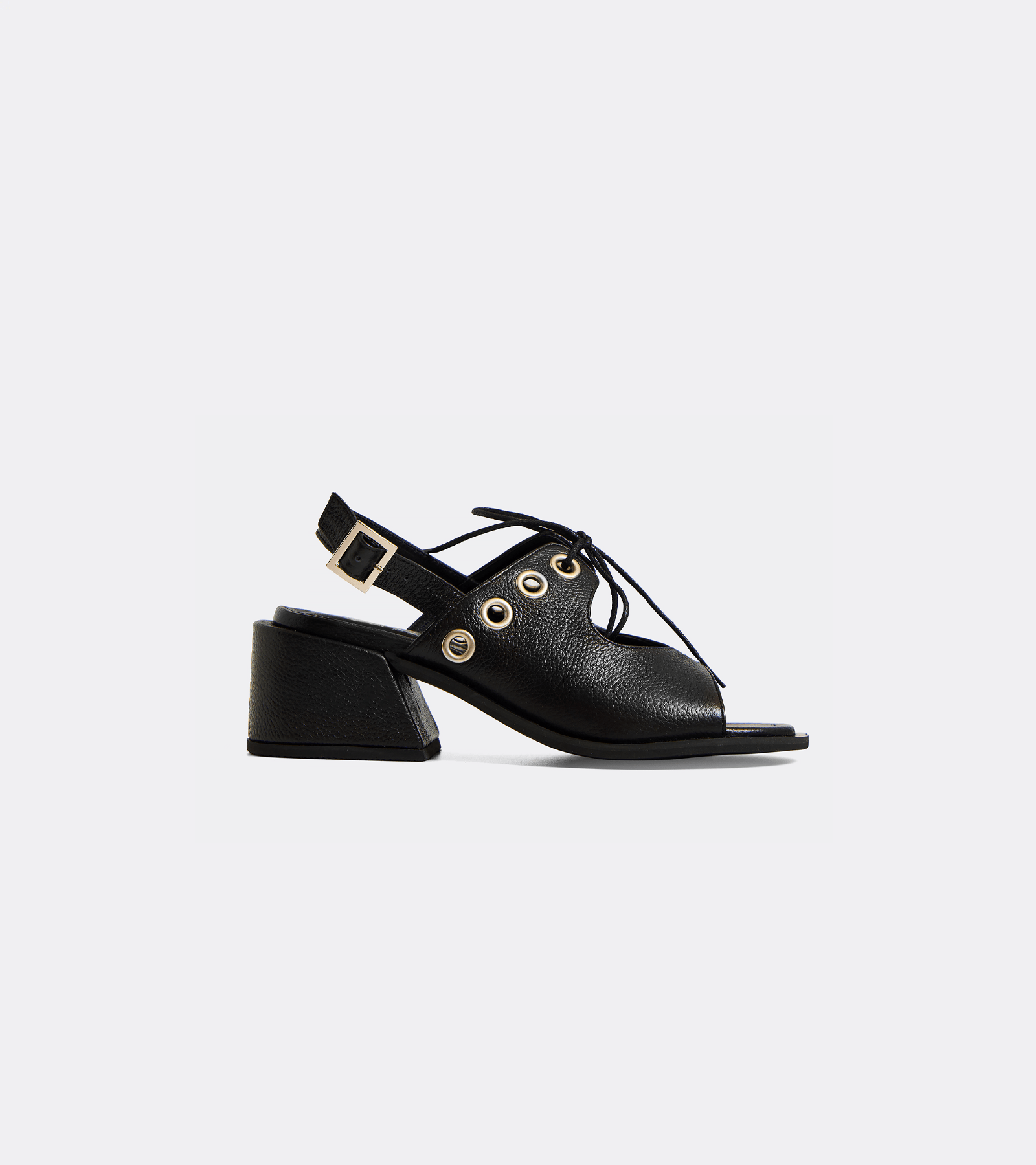 Sandalia negra de cuero flotar con cordones frontales y ojales metálicos, de suela gruesa.