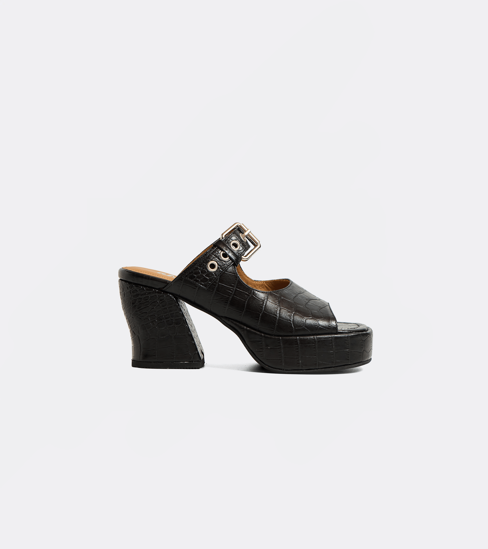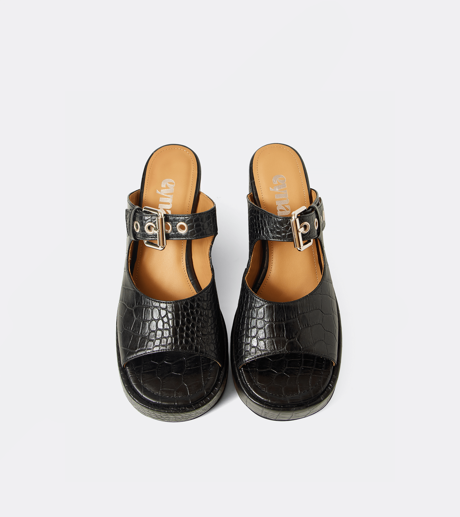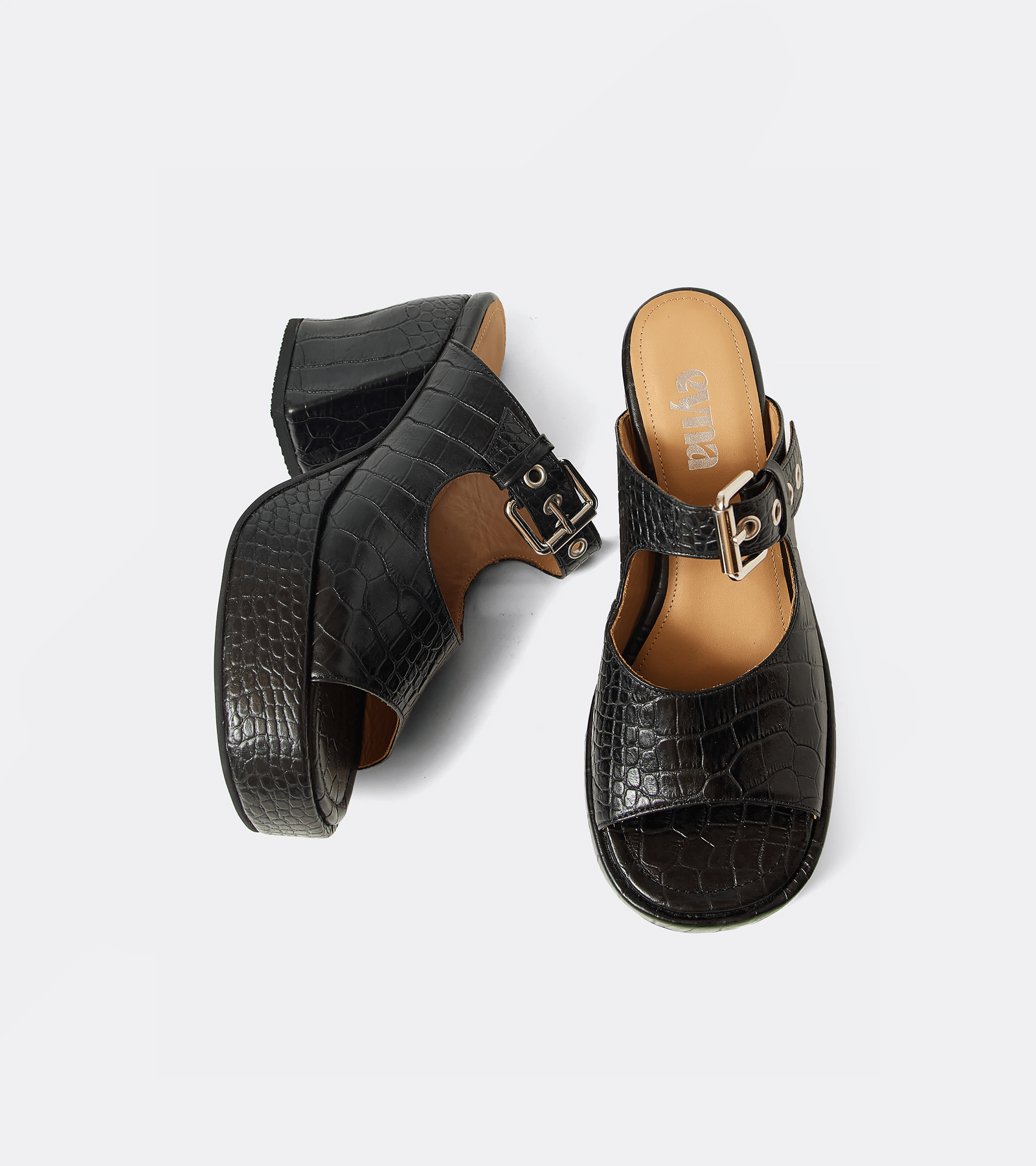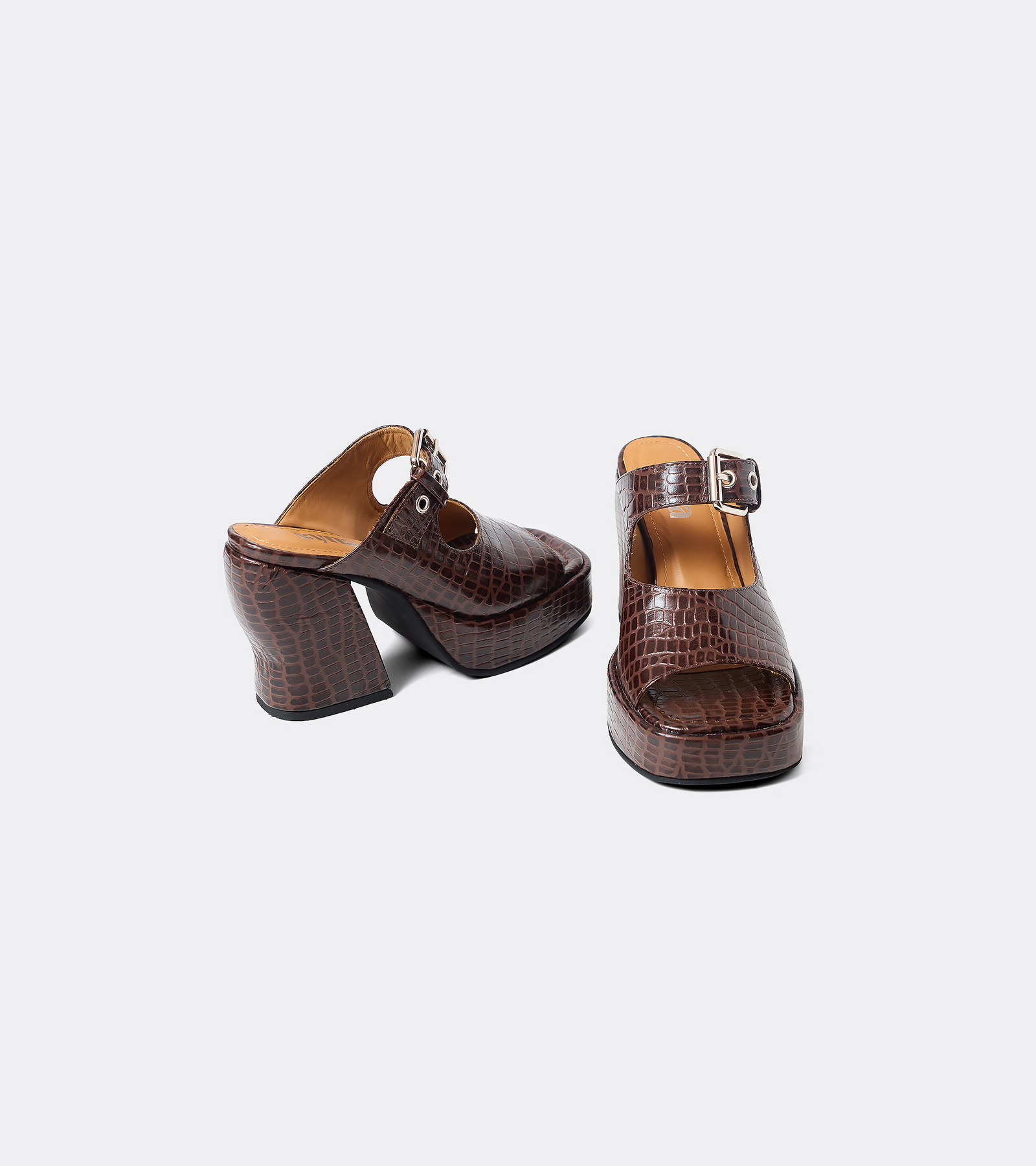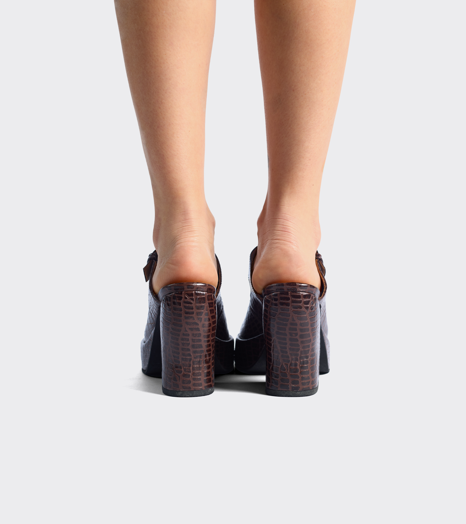 Sandalia mule setentera con plataforma y cuero croco marrón, retro-edgy y urbano.